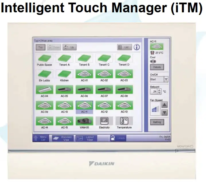Bộ điều khiển cảm ứng thông minh (iTC) Daikin DCM601B51là bộ điều khiển trung tâm tiên tiến, đóng vai trò làgiao diện chính để quản lý và giám sáthệ thống điều hòa không khí Daikin VRV. Đây là phiên bản kế nhiệm của model DCM601A51 trước đó.